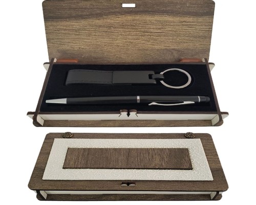 Ahşap Kutulu Siyah Kalem Ve Anahtarlık Set